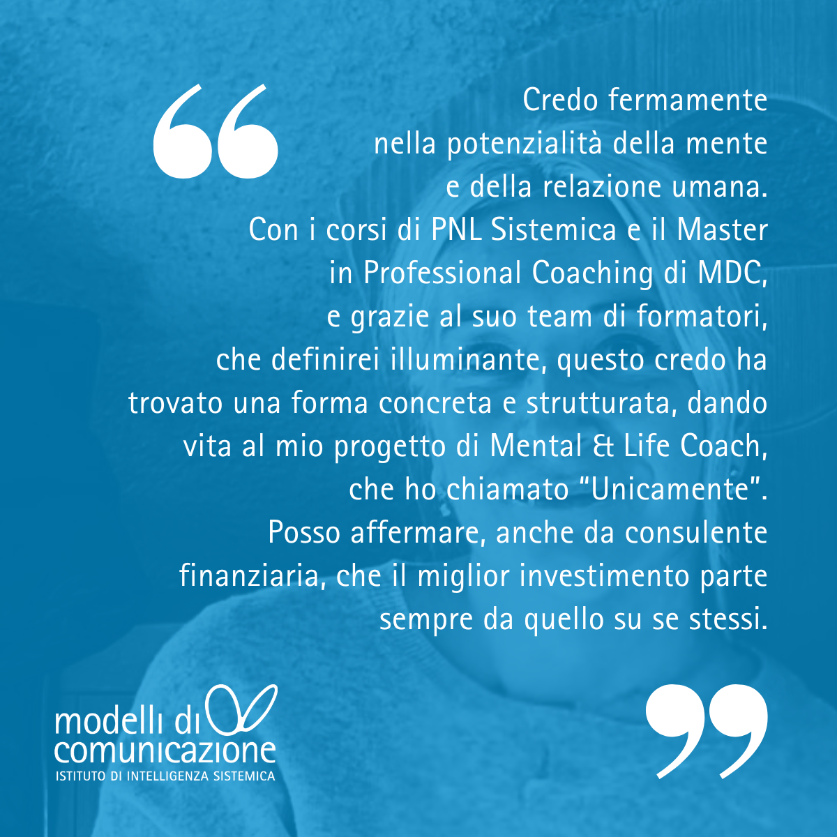 La nostra miglior reputazione sono i feedback dei corsisti che da 30 anni seguono i nostri percorsi di PNL Sistemica, di Counseling, di Coaching. Le testimonianze che seguono raccontano percorsi diversi, nati da motivazioni e obiettivi differenti. Non sono “recensioni”, ma frammenti di esperienza che possono aiutarti a capire se questo approccio ti appartiene. Clicca sulle singole card per leggerle